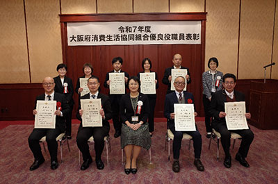 後列左から、大江会長、秋山さん(大阪よどがわ市民生協)、髙橋さん・安原さん(関西大学生協)、【会員生協の受賞者】