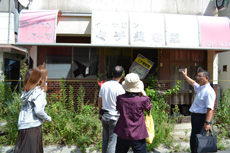 避難指示区域の境界線の道路 右側の帰宅困難区域では建物入口に鍵付バリケード 左側は居住制限区域