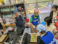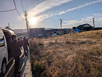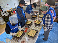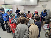 ●1日目は初めての活動となる能登町は秋吉公民館でのたこ焼きサロン活動となりました。地域には約100世帯の方が住んでおられ、国指定重要無形民俗文化財の「アマメハギ」(小中学生が鬼にふんして家々を訪問)が行われている地区です。来られた方は、たこ焼きに興味津々。見ているだけではなく「初めてですが、焼いてみたい」ということで、ほとんどの方が、たこ焼きを体験されました。また、天気も良かったので、外で食べながら交流。「初めてのたこ焼き、ひっくり返すのが難しかったけど楽しかった」「自分で焼いた、たこ焼きは、おいしい」など会話が弾みました。2日目は朝一番に、輪島市内の被災状況を視察。道はガタガタ。復興にはほど遠いく感じたとの参加者の感想でした。たこ焼きサロン活動はNGO「結」町野ベースで開催。当日は近くの「もとやスーパー」でドラマの撮影があり、ほとんどの方が見学に行ったり、炊き出し準備などをしたりしていたので、サロンの来場者はまばらでした。そうした中、いつも来られる方もいて「いつも、たこ焼き楽しみにしています。ありがとう」と言われ、少しでも元気になってもらいたいと思いました。たこ焼きサロン活動を通じた地域のコミュニティの大切さを感じます。微力は無力ではないと確信し、輪島市をあとにしました。