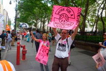 午後からは被団協の人たちと合流して、デモパレードのスタート地点であるタイムズスクエアに。気温30度を超える中、1万人以上の人々が集結。半数は日本人なのではないかと思うほど、日本人参加者が多かった。会場周辺は、前日に爆弾事件があったこともあってか、警官が多かったことが印象的。3時30分まではタイムズスクエアでの平和集会。さまざまな国の人が演説を行った。その中には、秋葉広島市長、田上長崎市長や長崎の被爆者である木村緋沙子さんなど日本人の姿も。3時30分からは、国連本部前までの約2kmを歩いた。踊りながら歩く人、楽器を演奏しながら歩く人、「No Nukes!」「No more ヒバクシャ」と叫びながら全体を扇動する人などさまざま。日本からの大勢の参加者も、それぞれの横断幕を手に行進していた。