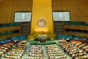 総会会場は、あいにく通訳機が壊れている席に座ったので(さらに登壇者が英語で話す人が少なかったため)、ほとんど聞くことができなかった。総会会場はアピールをするいわば記者会見場のようなもので、実質協議は別会場で行うということは知っていたが、思っていた以上に会場は閑散としていた。前日のイランやアメリカの演説のときにはもっと人がいたのであろうから、人気度なわけではないが、国際会議の舞台においても国によって注目される国とされない国の差がはっきりと表れるのだということを感じた。